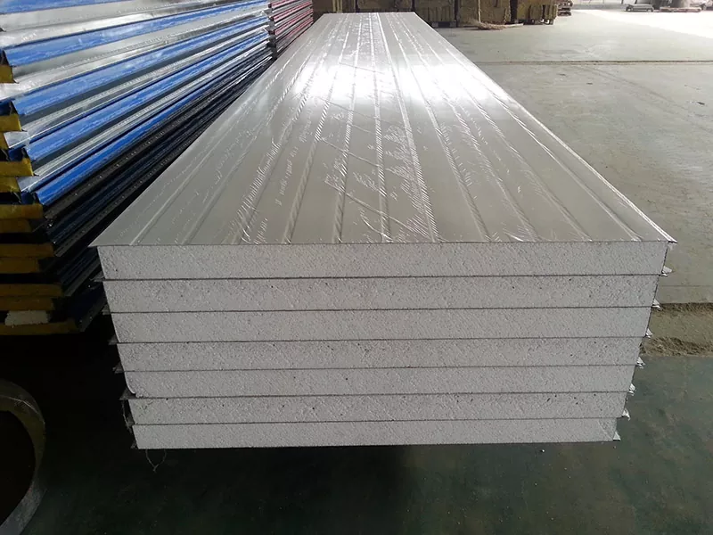 Ny takelaka sandwich EPS dia vita amin'ny toeram-pamokarana, miantoka ny fanaraha-maso tsara sy tsy miovaova. Ny fototry ny EPS dia miforona amin'ny fanitarana ny vakana polystyrene ary avy eo mipetaka eo anelanelan'ny takelaka metaly. Tapahana araka ny habeny avy eo ireo takelaka ary vonona ny hanaovana fivoriambe eny an-toerana.